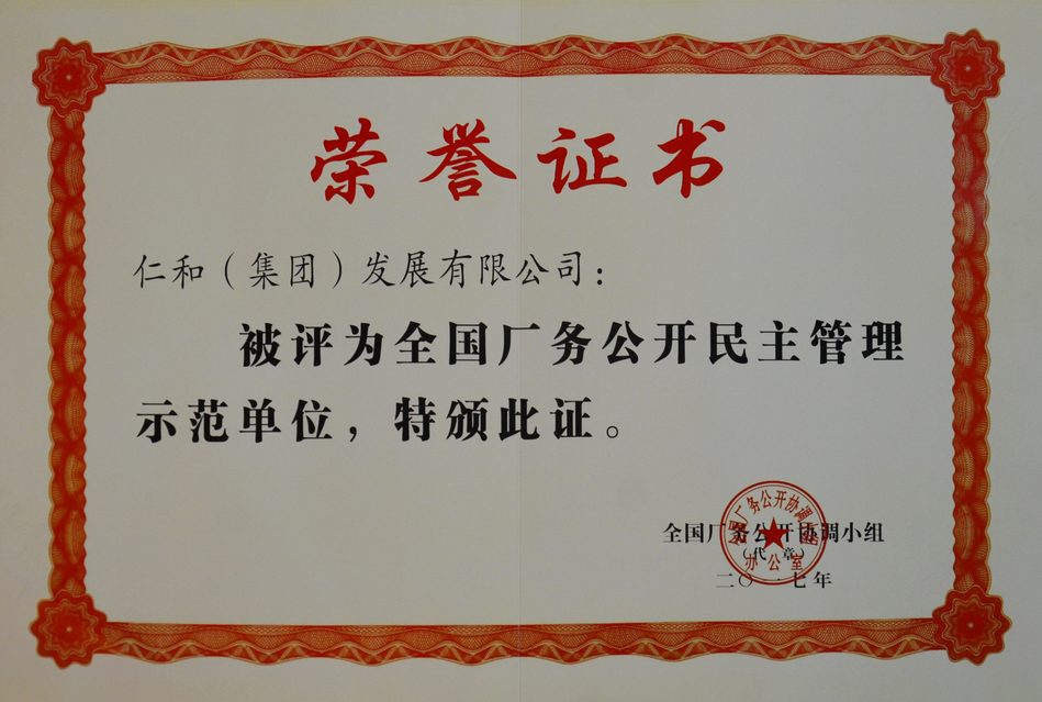 2017年全國廠務公開民主管理示范單位 榮譽證書 發布時間: 2019年12月18日 14:57:50 閱讀量: 9,343 下一篇:仁和集團榮膺“全國廠務公開民主管理示范單位”上一篇:集團榮獲2017年中國制藥工業百強
